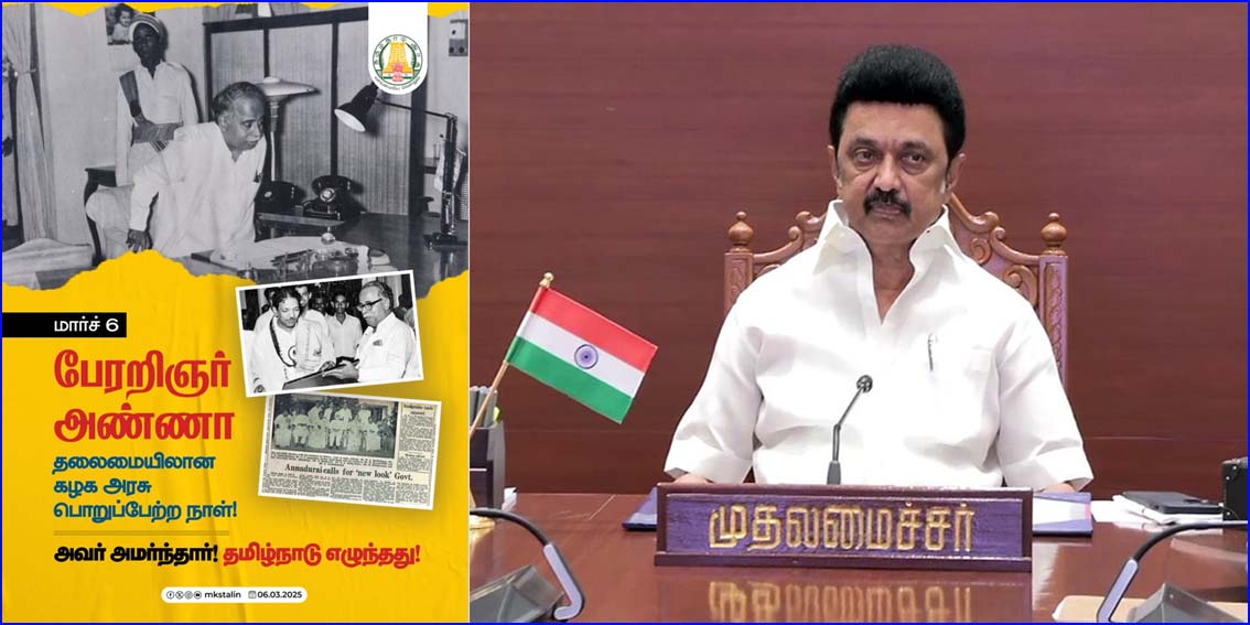 பேரறிஞர் அண்ணா தலைமையிலான அரசு பொறுப்பேற்ற நாளை சுட்டிக்காட்டி, திமுக தலைவரும் முதலமைச்சருமான மு.க.ஸ்டாலின் எக்ஸ் தளத்தில் பதிவு ஒன்றை வெளியிட்டுள்ளார். அந்த பதிவில்,  “அண்ணா அமர்ந்தார், தமிழ்நாடு எழுந்தது என குறிப்பிட்டுள்ளார்.