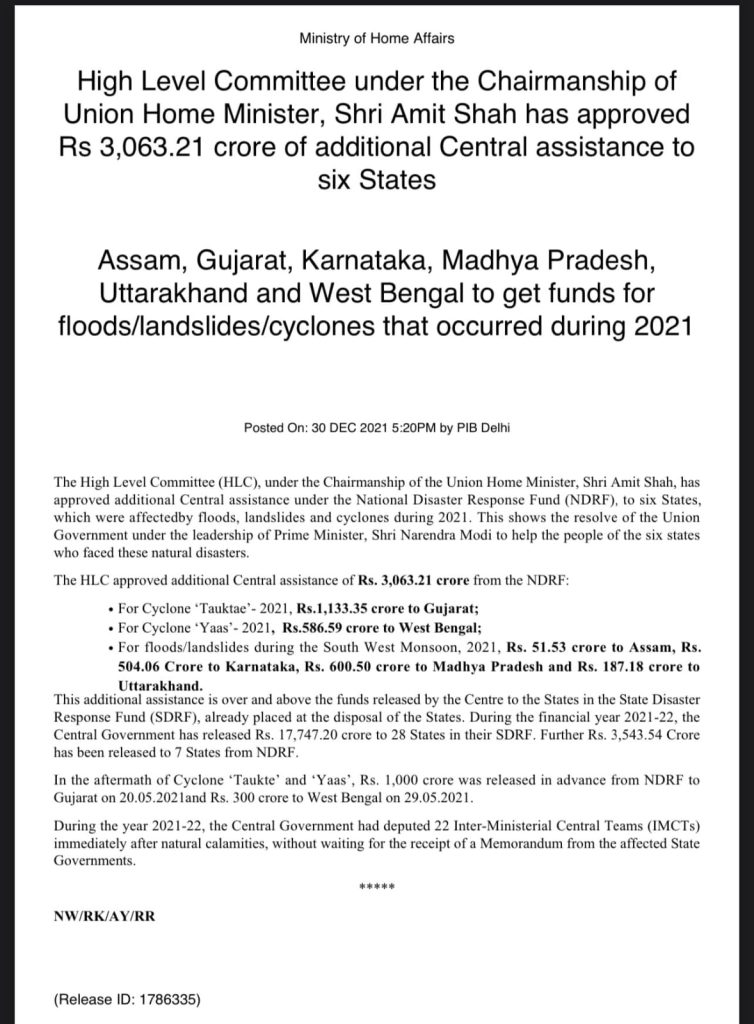 அதில் ட்வுதே புயலால் பாதிக்கப்பட்ட குஜராத் மாநிலத்திற்கு 1,133.35 கோடி ரூபாய் ஒதுக்கப்பட்டுள்ளது. அதேபோல் யாஸ் புயல் பாதிப்பிற்கு உள்ளான மேற்கு வங்கத்திற்கு 586.59 கோடி ரூபாய் வழங்கப்பட்டுள்ளது. இவை தவிர தென்மேற்கு பருவ மழையில் பாதிப்பு அடைந்த அசாம் மாநிலத்திற்கு 51.53 கோடி ரூபாய், கர்நாடகா மாநிலத்திற்கு 504.06 கோடி ரூபாய் ,மத்திய பிரதேசத்திற்கு 600.50 கோடி ரூபாயும், உத்தராகண்டிற்கு 187.18 கோடி ரூபாயும் ஒதுக்கப்பட்டுள்ளன. வடகிழக்கு பருவமழையால் பாதிக்கப்பட்ட தமிழ்நாட்டை பற்றி இந்த அறிவிப்பில் இடம்பெறவில்லை . மேலும் தற்போது வரை முதற்கட்டமாகவும் எந்தவித நிதியும் ஒதுக்கப்படவில்லை.
