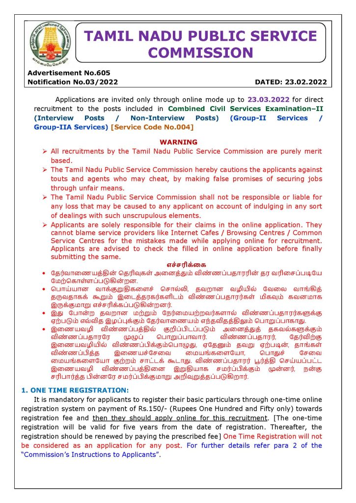ஒருங்கிணைந்த குடிமைப் பணிகள் தேர்வு -2 (நேர்முகத் தேர்வு பதவிகள் மற்றும் நேர்முகத் தேர்வு அல்லாத பதவிகள்) பணிகளில் அடங்கிய பதவிகளுக்கான காலிப்பணியிடங்களில் நேரடி நியமனம் செய்வதற்கான எழுத்துத் தேர்விற்கு 2022, மார்ச் 23ஆம் தேதி வரை இணைய வழி மூலம் மட்டுமே விண்ணப்பங்கள் வரவேற்கப்படுகின்றன என்று தெரிவிக்கப்பட்டுள்ளது.