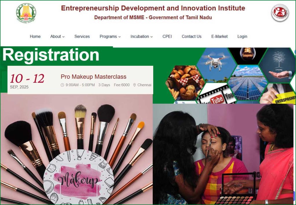 அதன்படி, தொழில் முனைவோர் மேம்பாடு மற்றும் புத்தாக்க நிறுவனத்தின் மூன்று நாள் மேக்கப் மாஸ்டர்கிளாஸ் பயிற்சி வரும் 10.09.2025 முதல் 12.09.2025 வரை காலை 10 மணி முதல் மாலை 5.00 மணி நடைபெற உள்ளது. பிரைடல், ஃபேஷன், சினிமா, HD மேக்கப், ஹேர்ஸ்டைல், ஸ்கின் கேர், SFX வரை அனைத்தும் ஒரே இடத்தில் கற்கும் முழுமையான பயிற்சி அளிக்கப்பட உள்ளது.
