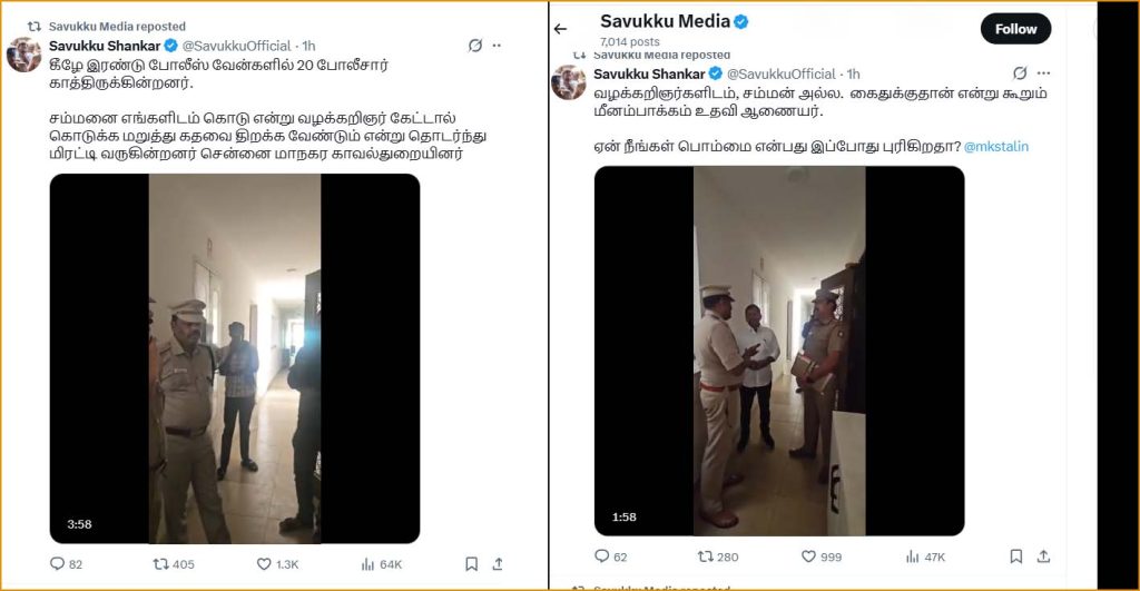 “என்னை கைது செய்ய வந்த 20 போலீஸ்”! என சவுக்கு சங்கரே வீடியோ வெளியிட்டுஉள்ளார். சவுக்கு சங்கரை கைது செய்ய ஆதம்பாக்கம் போலீஸார் இரு வேனில் வந்து காத்திருப்பதாக தனது சமூகவலைதள பக்கத்தில் சவுக்கு சங்கர் தெரிவித்துள்ளார். மேலும் அவரது வழக்கறிஞர் சம்மனை கேட்டால் அதை தர போலீஸார் மறுப்பதாகவும் வீடியோ ஒன்றை போட்டுள்ளார்.