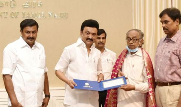 சென்னையில் உள்ள தலைமைச் செயலகத்தில் நடந்த நிகழ்ச்சியில் ஐ.சண்முகநாதனுக்கு முதல்வர் மு.க.ஸ்டாலின் விருது வழங்கினார்.