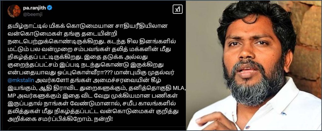 இந்த நிலையில், இயக்குநர் பா. ரஞ்சித் முதலமைச்சர் மு.க.ஸ்டாலின் வெளியிட்டுள்ள வீடியோவை எக்ஸ் தளத்தில் பதிவிட்டு அவருக்கு கேள்வி எழுப்பி உள்ளார். அதுகுறித்துரஞ்சித் வெளியிட்டுள்ள எக்ஸ் தள பதிவில்,