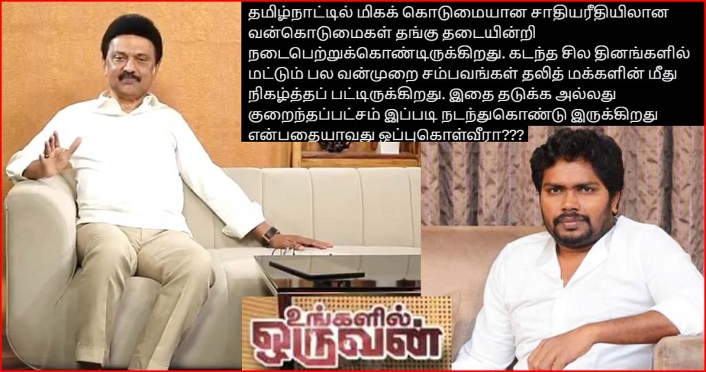 தமிழ்நாட்டில் மிகக் கொடுமையான சாதியரீதியிலான வன்கொடுமைகள் தங்கு தடையின்றி நடைபெற்றுக்கொண்டிருக்கிறது. கடந்த சில தினங்களில் மட்டும் பல வன்முறை சம்பவங்கள் தலித் மக்களின் மீது நிகழ்த்தப் பட்டிருக்கிறது. இதை தடுக்க அல்லது குறைந்தப்பட்சம் இப்படி நடந்துகொண்டு இருக்கிறது என்பதையாவது ஒப்புகொள்வீரா??? மான்புமிகு முதல்வர் ஸ்டாலின், அவர்களே!!