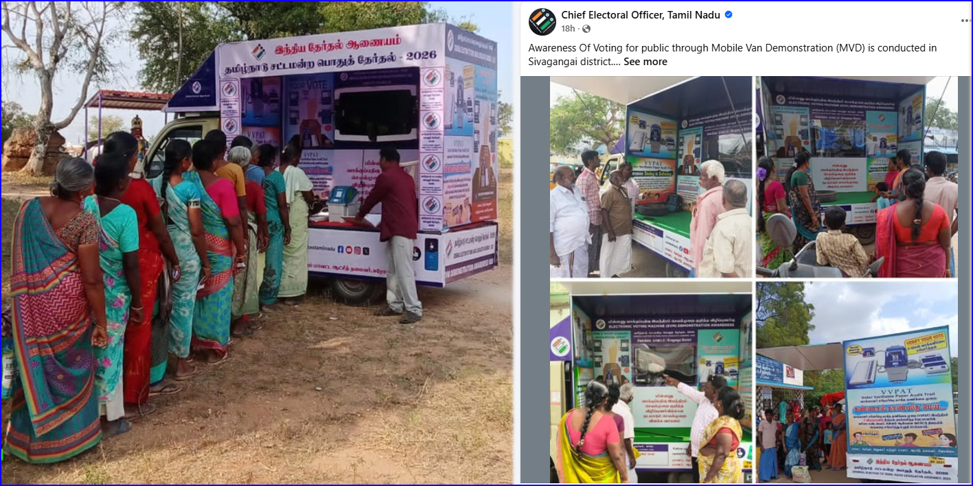 இதுதொடர்பாக தமிழக தலைமை தேர்தல் அதிகாரி அர்ச்சனா பட்நாயக் வெளியிட்டுள்ள அறிக்கையில், வாக்காளர் விழிப்புணர்வை ஊக்குவிக்க, இந்திய தேர்தல் ஆணையம் தமிழ்நாடு முழுவதும் நடமாடும் செயல்விளக்க வாகனம் மற்றும் இவிஎம் செயல்முறை விளக்க மையங்களை தொடங்கியுள்ளது.