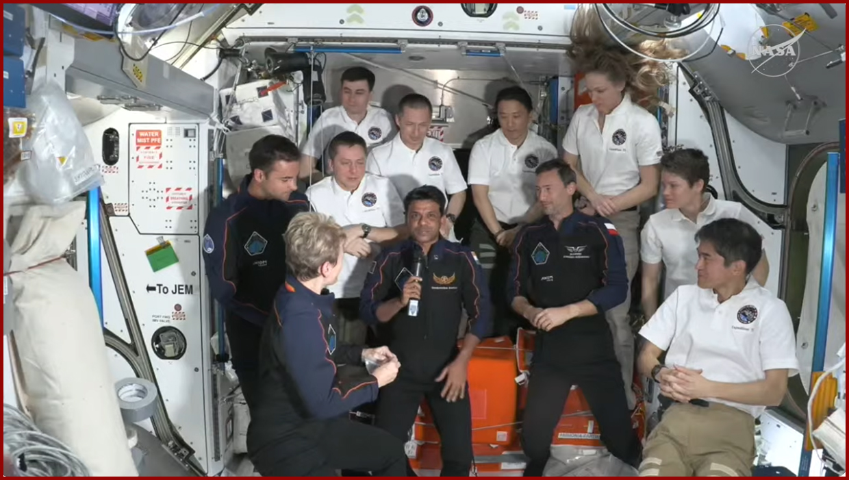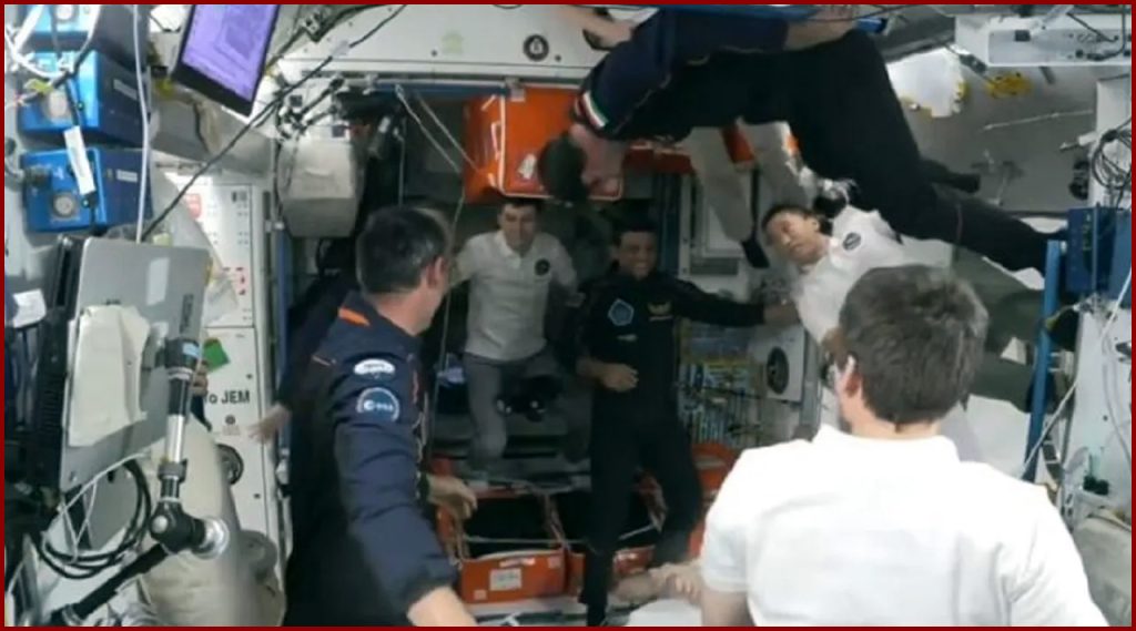 இதைத்தொடர்ந்து, இந்திய விண்வெளி வீரர் சுக்லாஉள்பட 4 பேரும் சர்வசதேச விண்வெளி நிலையத்திற்குள் சென்றனர். அவர்களுக்கு அங்கிருந்தவர்கள் குளிர்பானங்கள் (welcome drink) கொடுத்து வரவேற்றனர்.