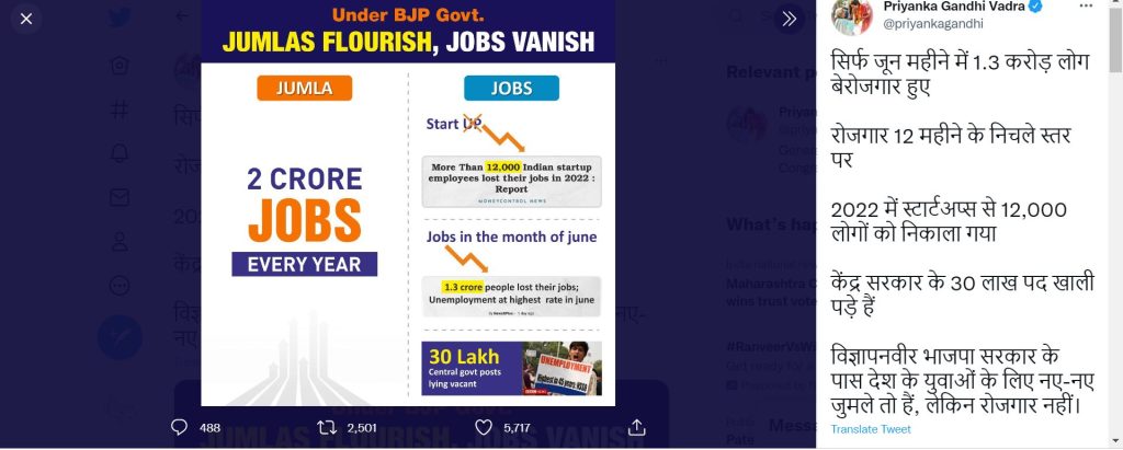 இதுகுறித்து அவர் வெளியிட்டுள்ள டிவிட்டர் பதிவில், மத்திய பாஜக அரசு, வெற்று பேச்சு பேசி இளைஞர்களை ஏமாற்றுகிறதே ஒழிய வேலை தர மறுக்கிறது என்றும் கடந்த 2022 -ல் ஸ்டார்ட் அப் கம்பெனிகளில் மட்டும் 12 ஆயிரம் பேர், வேலையில் இருந்து வெளியேற்றப்பட்டு உள்ளதாகவும், 30 லட்சம் அரசு வேலை காலியாக இருக்கிறது என குற்றஞ்சாட்டியுள்ளார்.
