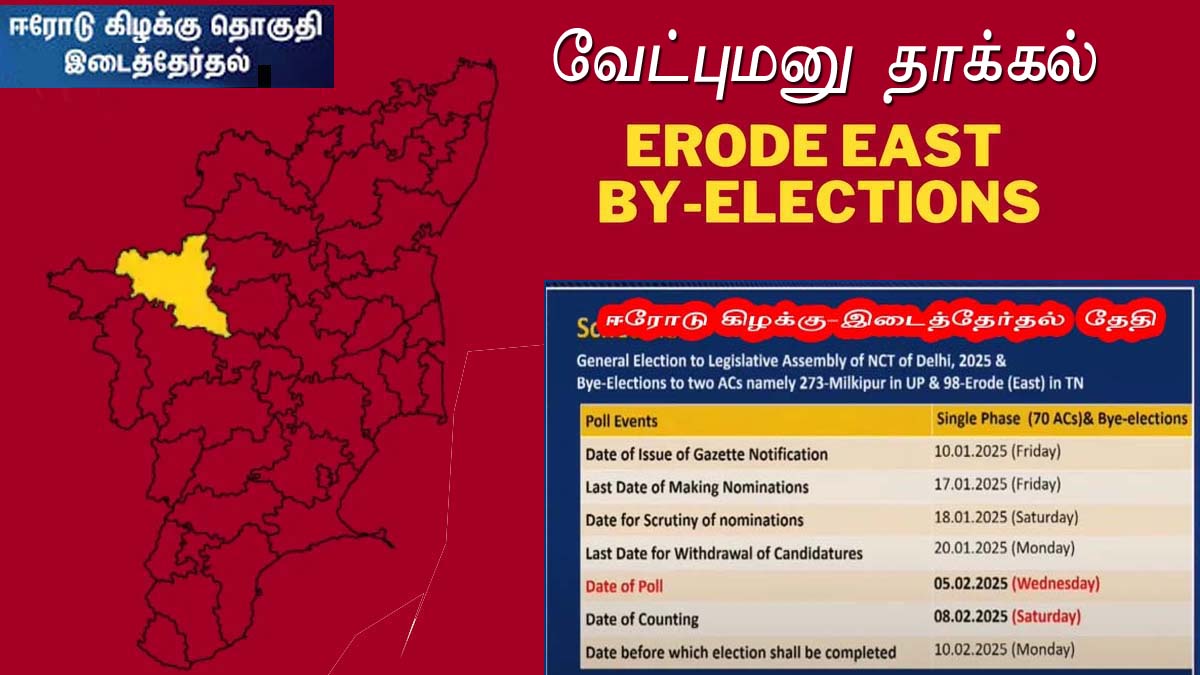 மூத்த காங்கிரஸ் உறுப்பினரும், எம்எல்ஏவுமான இவிகேஎஸ் இளங்கோவன் மறைந்ததால் காலியாக உள்ள ஈரோடு கிழக்கு இடைத்தேர்தல் தேதி ஈரோடு கிழக்கு சட்டப்பேரவைத் தொகுதிக்கான இடைத்தேர்தல் தேதியை இந்திய தேர்தல் ஆணையம் அறிவித்துள்ளது. அதன்படி, ஈரோடு சட்டப்பேரவை இடைத்தேர்தலுக்கான வாக்குப்பதிவு பிப்ரவரி 5ஆம் தேதி நடைபெறும் என்றும் வாக்கு எண்ணிக்கை பிப்ரவரி 8ஆம் தேதி நடைபெறும் என்றும் அறிவிக்கப்பட்டுள்ளது.