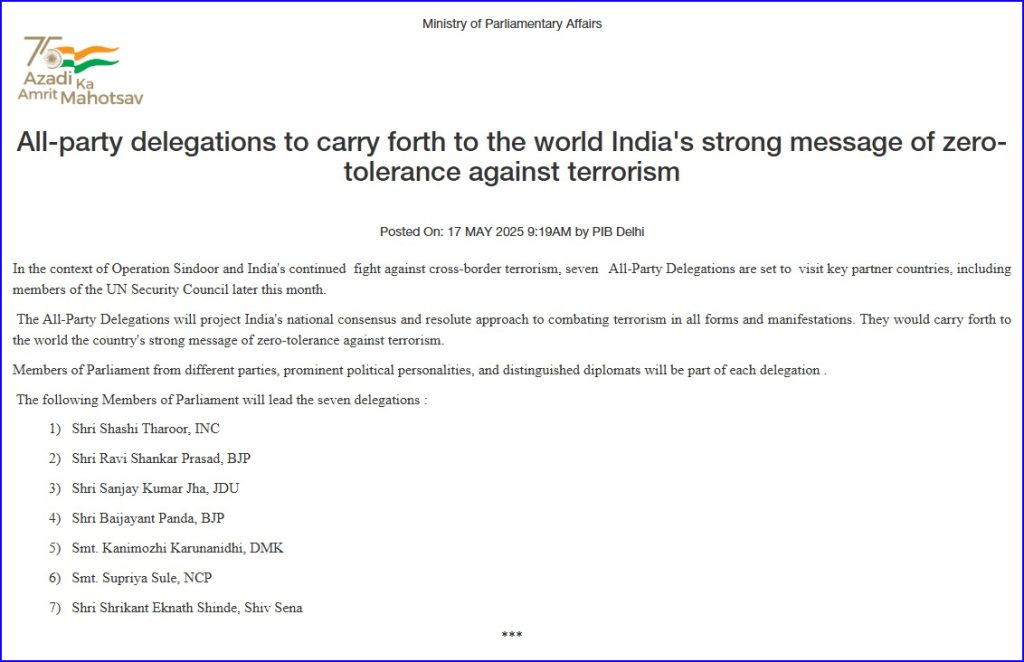 இதையத்து இரு நாளுகளுக்கும் இடையே போர் பதற்றம் ஏற்பட்ட நிலையில், உலக நாடுகளின் வேண்டுகோளை ஏற்று போர் நிறுத்தம் செய்யப்பட்டது. இந்த நிலையில், இந்திய அரசின் ‘ஆபரேஷன் சிந்தூர்’ நடவடிக்கை குறித்து உலக நாடுகளுக்கு விளக்க , குழு அமைக்கப்பட்டு, அந்த குழு மூலம் விரைவில் சர்வதேச சுற்றுப்பயணம் மேற்கொள்ள இருப்பதாக தெரிவிக்கப்பட்டது.