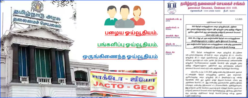 அரசு ஊழியர்கள் மற்றும் ஆசிரியர்கள் சங்கங்களான ஜாக்டோ ஜியோ, திமுக கொடுத்த பழைய ஒய்வூதியம் திட்டம் வாக்குறுதியை நிறைவேற்றாத நிலை யில், அதை கண்டிப்பது உள்பட பல்வேறு கோரிக்கைககளை வலியுறுத்தி போராட்டம் அறிவித்து உள்ளது. இந்த நிலையில், அரசு ஊழியர்கள் மற்றும் ஆசிரியர்களின் ஓய்வூதிய திட்டம் குறித்து ஆராயக் குழு அதிகாரிகளைக்கொண்ட குழுவை தமிழ்நாடு அரசு அமைத்துள்ளது. அதன்படி, பழைய ஓய்வூதியம், பங்களிப்பு ஓய்வூதியம், ஒருங்கிணைந்த ஓய்வூதியம் ஆகிய மூன்று குறித்து ஆய்வு செய்ய இருப்பதாக அறிவித்து உள்ளது.
