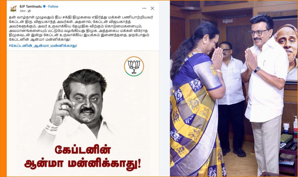 பா.ஜ.க தனது எக்ஸ் தளத்தில் வெளியிட்டுள்ள பதிவில், தன் வாழ்நாள் முழுவதும் தீய சக்தி திமுகவை எதிர்த்து மக்கள் பணியாற்றியவர் கேப்டன் திரு. விஜயகாந்த் அவர்கள். அதனால், கேப்டன் விஜயகாந்த் அவர்களுக்கும், அவர் உருவாக்கிய தேமுதிக-விற்கும் கொடுமைகளையும், அவமானங்களையும் மட்டுமே வழங்கியது திமுக.