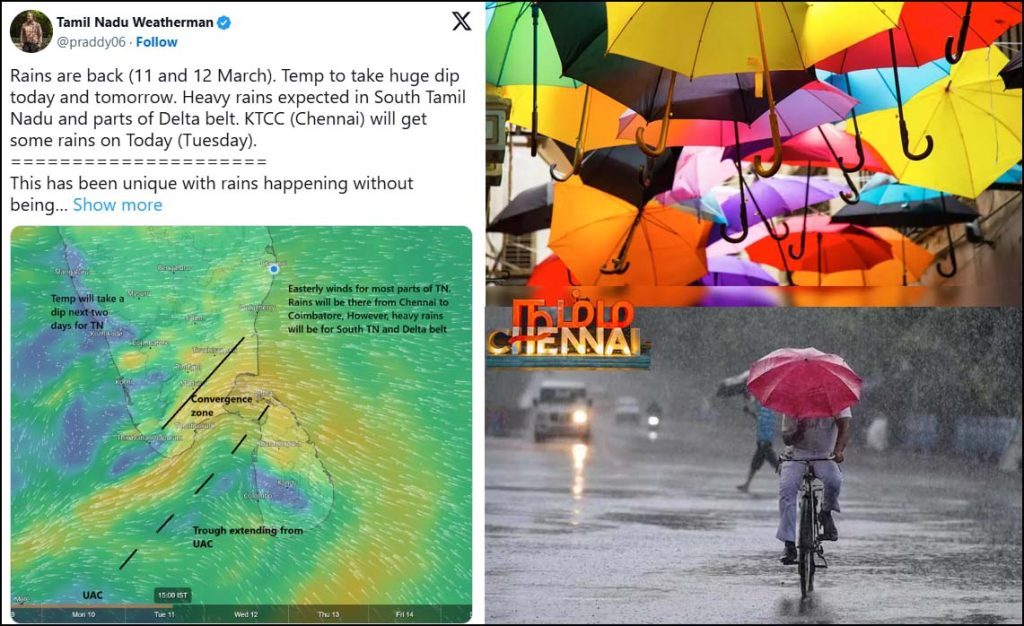 இன்றும் நாளையும் (மார்ச் 11 மற்றும் 12) வெப்பநிலை கணிசமாகக் குறையும். அதேநேரம், தென் தமிழகம் மற்றும் டெல்டா பெல்ட்டின் சில பகுதிகளில் கனமழை எதிர்பார்க்கப்படுகிறது. சென்னை சுற்றுவட்டாரத்தை பொறுத்தவரை இன்று (செவ்வாய்க்கிழமை) ஓரளவு மழை பெய்யும்.