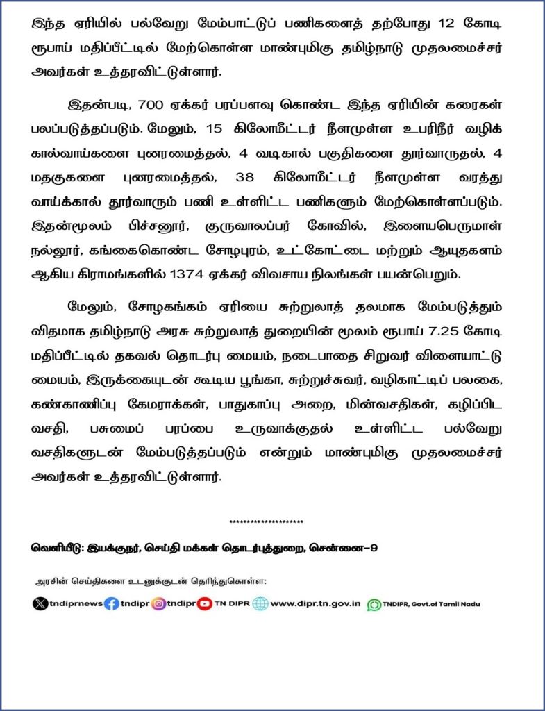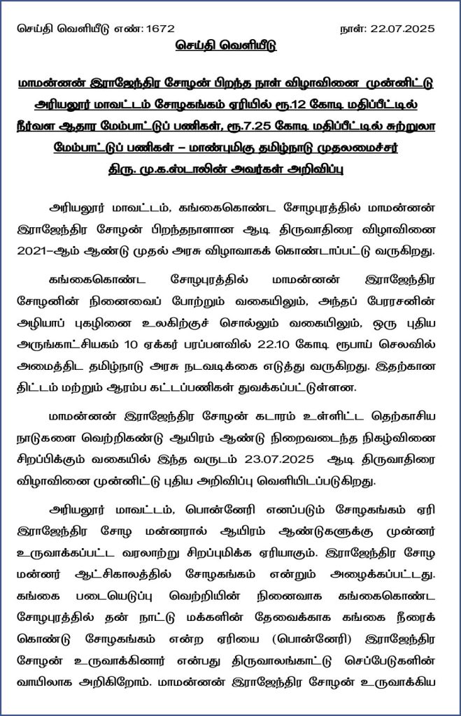 இவற்றின் தொடர்ச்சியாக, இராசேந்திர சோழனின் பிறந்தநாளில், அவர் உருவாக்கிய சோழகங்கம் ஏரியில் நீர்வள ஆதார மேம்பாட்டுப் பணிகளும் – சுற்றுலா மேம்பாட்டுப் பணிகளும் மேற்கொள்ளப்படும் என்று அறிவிப்பதில் பெருமகிழ்ச்சி கொள்கிறேன்!”