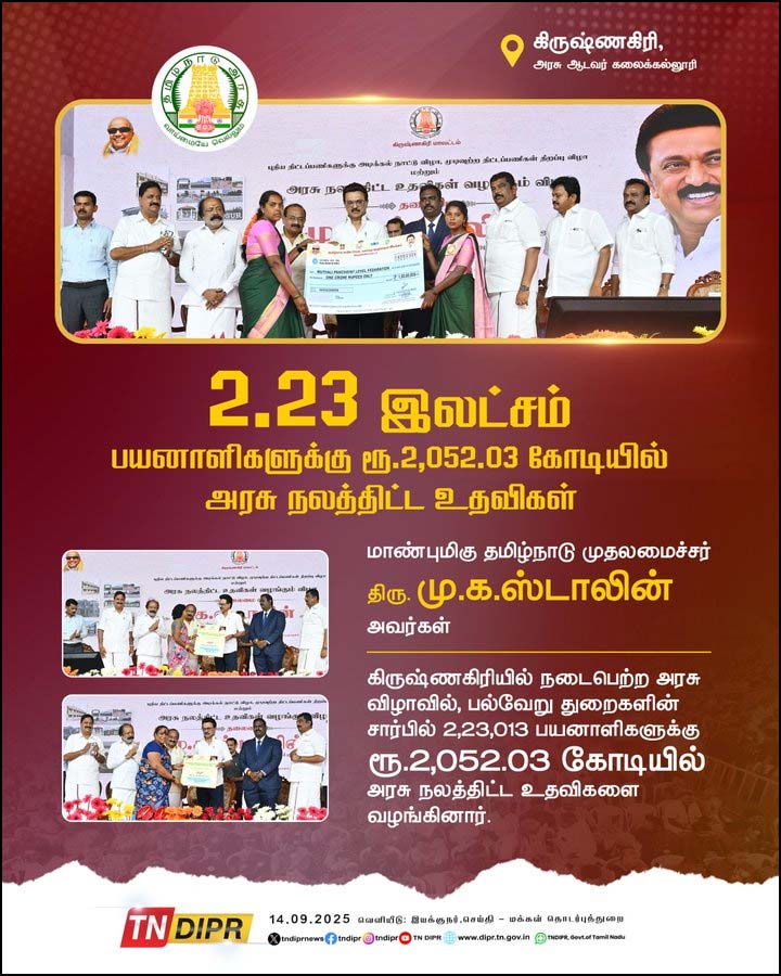 கிருஷ்ணகிரி மாவட்டத்தில்   தமிழக அரசின் ’புதிய திட்டப்பணிகள் தொடக்கம் மற்றும் நலத்திட்ட உதவிகள் வழங்கும் விழா’  நேற்று (செப்டம்பர் 14) அன்று நடைபெற்றது. இந்த விழாவில் முதலமைச்சர் ஸ்டாலின் கலந்து கொண்டு நலத்திட்ட உதவிகளை பயனாளர்களுக்கு வழங்கினார்.