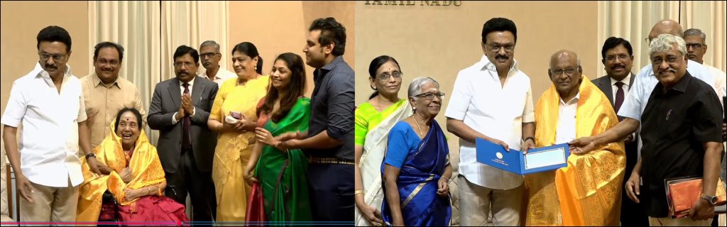 சென்னை: தமிழ்நாடு அரசு அறிவித்துள்ள கலைஞர் நினைவு கலைத்துறை வித்தகர் விருது மூத்த நடிகை எம்.என்.ராஜம், மூத்த இயக்குனர் எஸ்.பி.முத்துராமனுக்கு முதல்வர் மு.க.ஸ்டாலின் வழங்கி கவுரவித்தார்