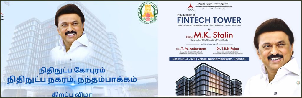 சென்னை நந்தம்பாக்கத்தில் அதிநவீன உட்கட்டமைப்புடன் கட்டப்பட்ட நிதிநுட்ப கோபுரம் (FINTECH TOWER) திறந்து வைத்தார் முதல்வர் மு.க.ஸ்டாலின் . தொழில், முதலீட்டு ஊக்குவிப்பு மற்றும் வர்த்தகத் துறை சார்பில் நிதிநுட்ப நகரத்தில் கோபுரம் கட்டப்பட்டுள்ளது. ரூ.249 கோடி செலவில் 2 அடித்தளங்கள், தரை மற்றும் 11 தளங்களுடன் 5.56 லட்சம் சதுர அடியில் கட்டப்பட்டுள்ளது.