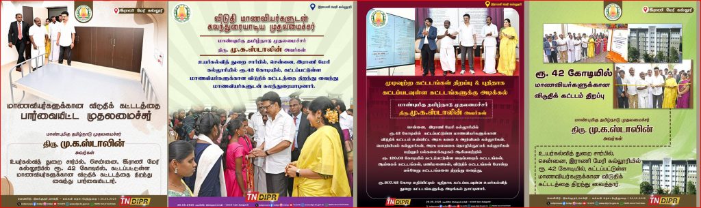 அந்த அறிவிப்பின்படி, சென்னை, இராணி மேரி கல்லூரியில் 42 கோடி ரூபாய் செலவில், நவீன வசதிகளுடன் 455 மாணவியர் தங்கிப் படிக்கும் வகையில் கட்டப்பட்டுள்ள விடுதிக் கட்டடத்தை தமிழ்நாடு முதலமைச்சர் அவர்கள் திறந்து வைத்து பார்வையிட்டார். பின்னர், அங்கு பயிலும் மாணவியர்களுடன் கலந்துரையாடினார்.