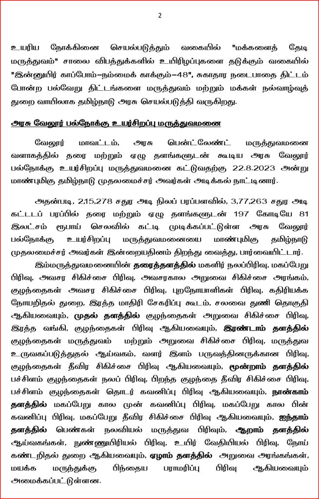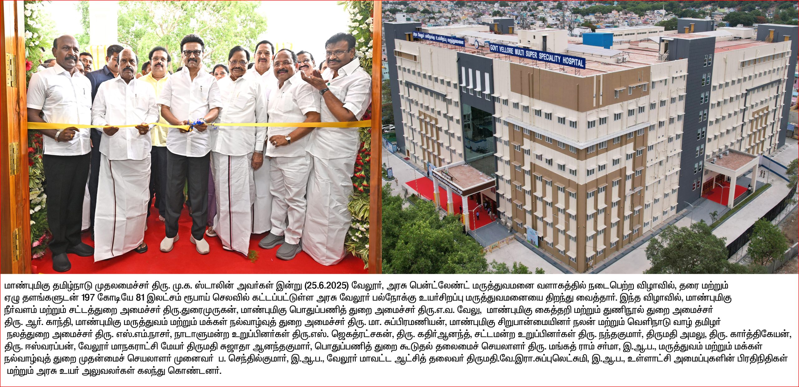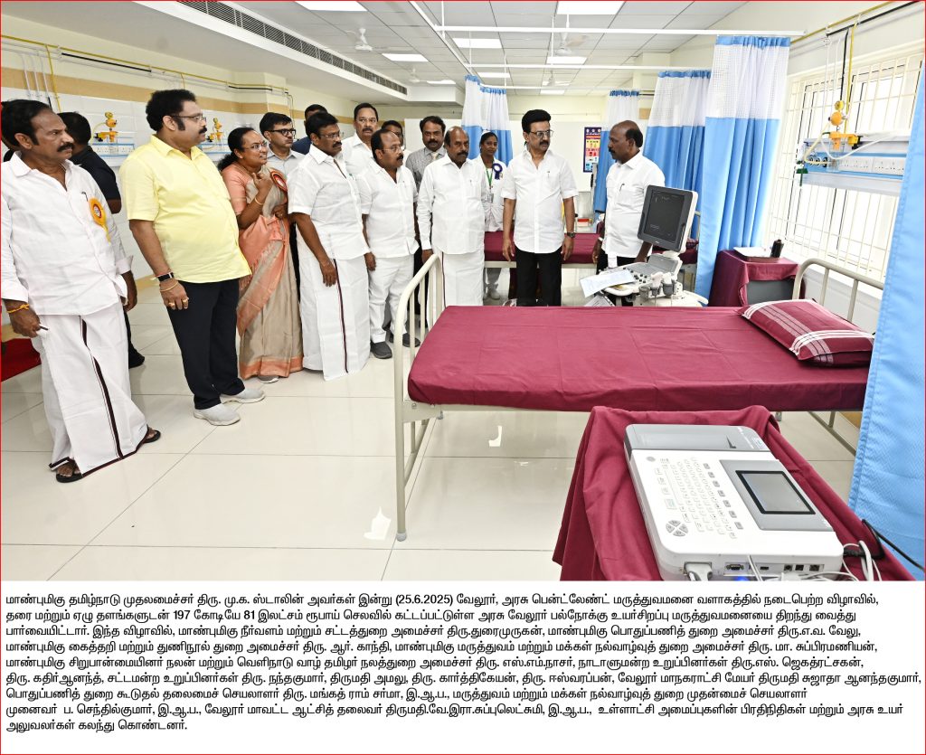 பின்னர் வாகனம் மூலமாக அங்கிருந்து மருத்துவமனையை வந்து அடைந்தார். பின்னர் வேலூரில் ரூபாய் 197 கோடியே 81 லட்சம் மதிப்பீட்டில் கட்டப்பட்டுள்ள பென்ட்லேண்ட் அரசு பல்நோக்கு உயர் சிறப்பு மருத்துவமனையை முதலமைச்சர் மு.க.ஸ்டாலின் திறந்து வைத்தார்.
