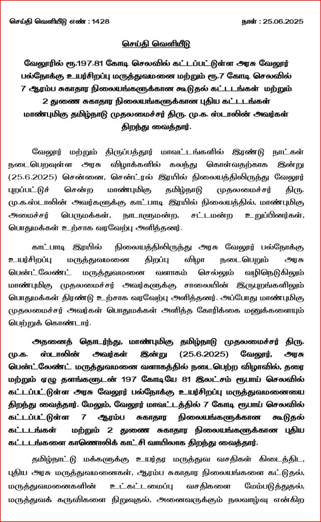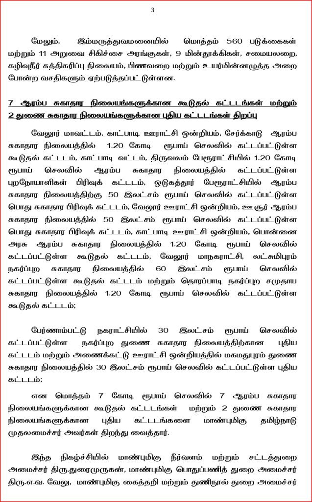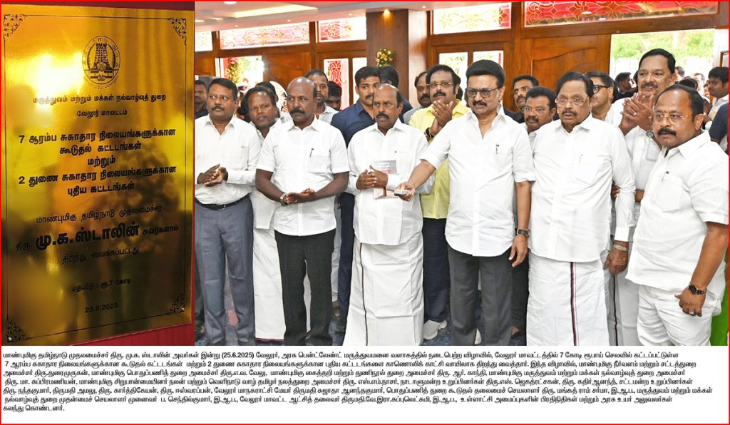 அதனைத்தொடர்ந்து 1.20 கோடி மதிப்பில் சேர்க்காடு ஆரம்ப சுகாதார நிலைய கட்டடம், ரூ.1.20 கோடி மதிப்பில் திருவலம் பேரூட்சி ஆரம்ப சுகாதார நிலைய கட்டடம், ரூ.50 இலட்சம் மதிப்பில் ஒடுகத்தூர் ஆரம்ப சுகாதார நிலைய கட்டடம், ரூ.50 இலட்சம் மதிப்பில் ஊசூர் ஆரம்ப சுகாதார நிலைய கட்டடம், ரூ.1.20 கோடி மதிப்பில் பொன்னை அரசு ஆரம்ப சுகாதார நிலைய கட்டடம், ரூ.60 இலட்சம் மதிப்பில் வேலூர் மாநகராட்சி லட்சுமிபுரம் நகர்ப்புற சுகாதார நிலைய கட்டடம், ரூ.1.20 கோடி மதிப்பில் தொரப்பாடி நகர்ப்புற சமுதாய சுகாதார நிலைய கட்டடம், ரூ.30 இலட்சம் மதிப்பில் பேர்ணாம்பட்டு நகர்ப்புற துணை சுகாதார நிலைய கட்டடம், ரூ.30 இலட்சம் மதிப்பில் அணைக்கட்டு மகமதுபுரம் துணை சுகாதார நிலைய கட்டடம் என , 9 இடங்களில் மொத்தம் ரூ.7 கோடி மதிப்பில் கட்டப்பட்டுள்ள கட்டடங்களையும் திறந்து வைத்தார்.