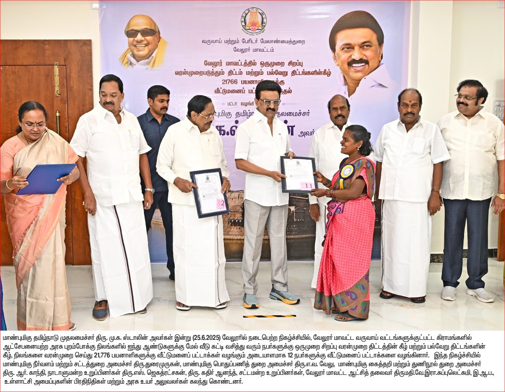 இதைத்தொடர்ந்து நடைபெற்ற நடைபெற்ற நிகழ்ச்சியில், வேலூர் மாவட்ட வருவாய் வட்டங்களுக்குட்பட்ட கிராமங்களில் ஆட்சேபனையற்ற அரசு புறம்போக்கு நிலங்களில் ஐந்து ஆண்டுகளுக்கு மேல் வீடு கட்டி வசித்து வரும் நபர்களுக்கு ஒருமுறை சிறப்பு வரன்முறை திட்டத்தின் கீழ் மற்றும் பல்வேறு திட்டங்களின் கீழ், நிலங்களை வரன்முறை செய்து 21,776 பயனாளிகளுக்கு வீட்டுமனைப் பட்டாக்கள் வழங்கும் அடையாளமாக 12 நபர்களுக்கு வீட்டுமனைப் பட்டாக்களை வழங்கினார்.