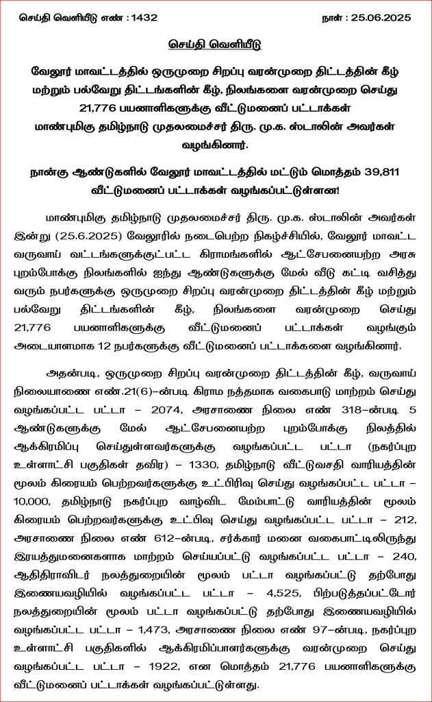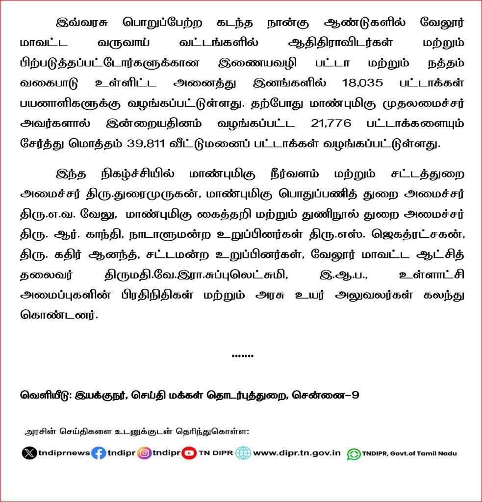 தற்போது முதலமைச்சர் மு.க.ஸ்டாலின் அவர்களால் வழங்கப்பட்ட 21,776 பட்டாக்களையும் சேர்த்து மொத்தம் 39,811 வீட்டுமனைப் பட்டாக்கள் வழங்கப்பட்டுள்ளது.