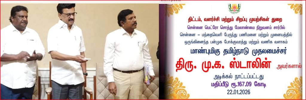 தொடர்ந்து,   ரூ.167.9 கோடியில்  கட்டப்பட உள்ள மந்தைவெளி பேருந்து பணிமனை மற்றும் முனையத்தில் போக்குவரத்து மற்றும் வணிக வளாகத்திற்கான கட்டுமான பணிக்கு அடிக்கல் நாட்டினார்.