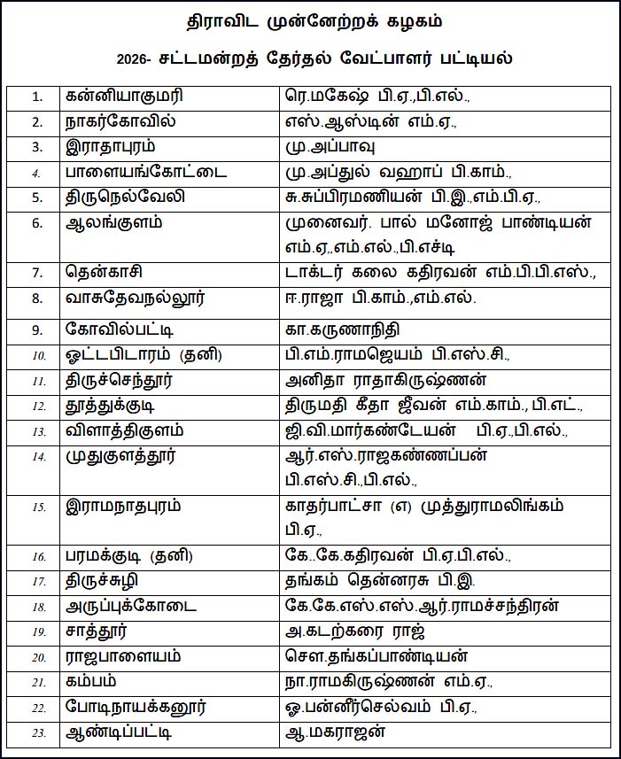 2026 சட்டமன்ற தேர்தலில் தி.மு.க போட்டியிடும் தொகுதி மற்றும் வேட்பாளர் பட்டியலை கழக தலைவர் முதலமைச்சர் மு.க.ஸ்டாலின் வெளியிட்டார். ஏற்கனவே கூட்டணி கட்சிகளுடன் தொகுதி பங்ககீடுகள் முடிந்து வேட்பாளர்கள் பட்டியல் வெளியிடப்பட்டு வருகிறது. இந்த வகையில் தி.மு.க கூட்டணியில், உள்ள கட்சிகளின் தொகுதிகள் வெளியானதை அடுத்து, தி.மு.க போட்டியிடும் தொகுதிகள் மற்றும் வேட்பாளர்கள் பட்டியலை கழக தலைவர் முதலமைச்சர் மு.க.ஸ்டாலின் இன்று அண்ணா அறிவாலயத்தில் வெளியிட்டார்.