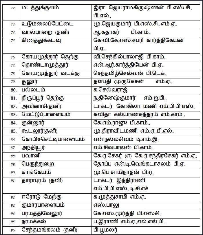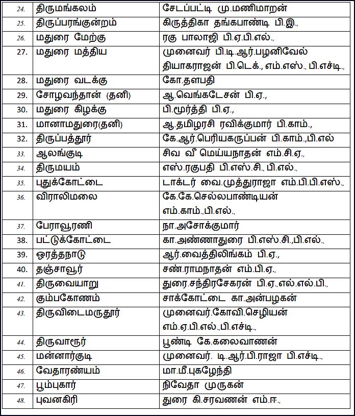 திமுக வேட்பாளர் பட்டியலில் இளைஞர்கள், பெண்கள், பட்டதாரிகளுக்கு முன்னுரிமை அளிக்கப்பட்டுள்ளது. இதில் 60-க்கும் மேற்பட்ட புதிய முகங்களுக்கு வாய்ப்பு வழங்கப்பட்டுள்ளது. வேட்பாளர்கள் பட்டியலில் பெண் 18 பேரும் அடங்குவர். 125 பேர் பட்டதாரிகள் ஆவர். இதில் 15 பேர் மருத்துவர்கள், 17 பொறியாளர்கள், 29 பேர் வழக்கறிஞர்கள், 7 பேர் முனைவர் பட்டம் பெற்றவர்கள் ஆவர்.