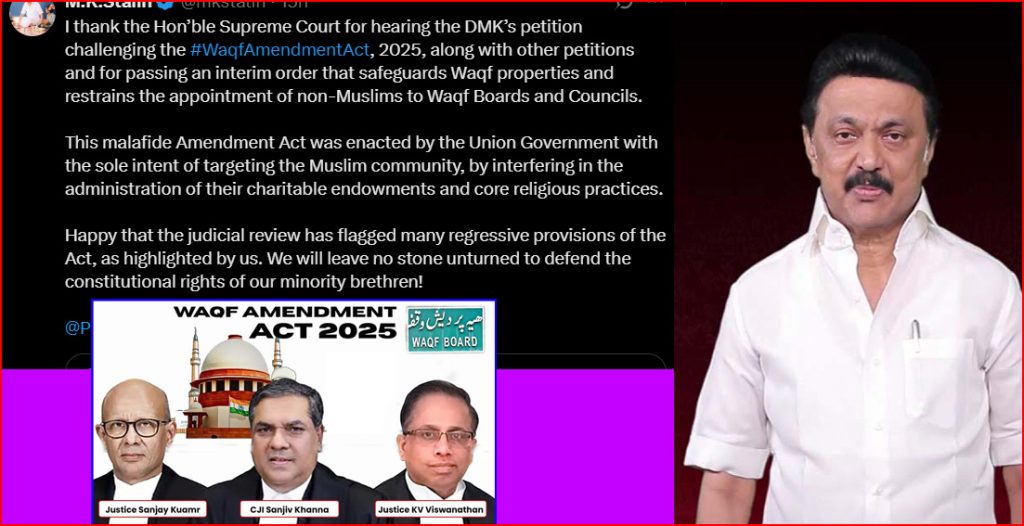 இதுகுறித்து முதலமைச்சர் தனது எக்ஸ் தள பக்கத்தில் வெளியிட்டுள்ள பதிவில், வக்பு சொத்துகளை பாதுகாக்கும் வகையில் இடைக்கால உத்தரவு பிறப்பித்த உச்சநீதிமன்றத்திற்கு நன்றி.