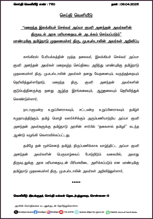 தமிழே தன் மூச்செனத் தமிழ்த் திருப்பணிக்காக வாழ்ந்திட்ட குமரி அனந்தன் பெருவாழ்வைப் போற்றிடும் வகையில், அவரது உடலுக்கு அரசு மரியாதையுடன் பிரியாவிடை அளிக்கப்படும் என முதல்வர் அறிவித்துள்ளார்.