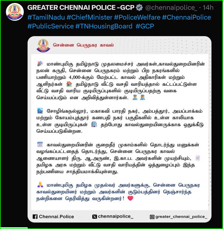 அதில், ‘சென்னை, தாம்பரம், ஆவடி மற்றும் கோவை நகரங்களில் உள்ள போலீஸாருக்கான குடியிருப்பு தேவையை பூர்த்தி செய்வதற்கு சென்னை சோழிங்கநல்லூர், மகாகவி பாரதி நகர், அம்பத்தூர், அயப்பாக்கம் மற்றும் கோவை கணபதி நகர் ஆகிய இடங்களில் தமிழ்நாடு வீட்டு வசதி வாரியத்தால் கட்டப்பட்டுள்ள வீட்டு வசதி வாரிய குடியிருப்புகளில் போலீஸார் குடியிருப்பதற்கு வகை செய்யப்படும்’ என தெரிவித்துள்ளார்.