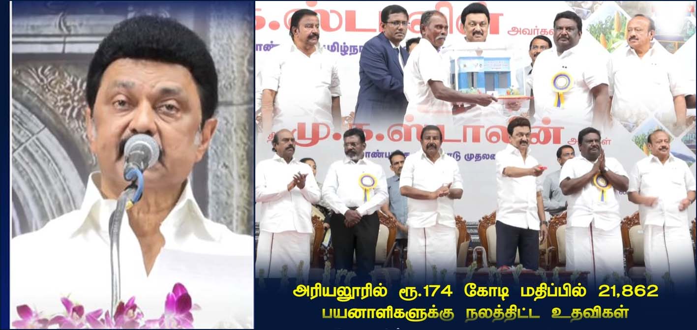 இந்த நிகழ்ச்சியில், அரியலூரில் ரூ.174 கோடி மதிப்பில் 21,862 பயனாளிகளுக்கு நலத்திட்ட உதவிகள் வழங்கினார்.