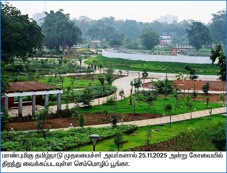 அப்பணிகள் அனைத்தும் நிறைவுற்ற நிலையில், 25.11.2025 அன்று காலை, உலகத்தரத்தில் பல்வேறு நவீன வசதிகளுடன் 45 ஏக்கர் பரப்பளவில், ரூ.208.50 கோடி செலவில் அமைக்கப்பட்டுள்ள கோவை செம்மொழிப் பூங்காவினை தமிழ்நாடு முதலமைச்சர் அவர்கள் மக்கள் பயன்பாட்டிற்காகத் திறந்து வைக்கிறார்கள்.