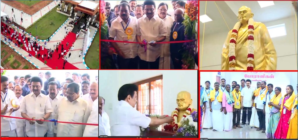 விழுப்புரம்: கள ஆய்வுக்கு விழுப்புரம் சென்றுள்ள முதலமைச்சர் மு.க.ஸ்டாலின் இன்று காலை முன்னாள் அமைச்சர் ஏ.கோவிந்தசாமி நினைவு அரங்கம் மற்றும் 21 சமூக நீதிப் போராளிகள் மணிமண்டபம் ஆகியவற்றை முதலமைச்சர் மு.க.ஸ்டாலின் திறந்து வைத்தார். அப்போது, திராவிட இயக்கத்தின் தலைமகனாக திகழ்ந்தவர் ஏ.கோவிந்தசாமி என புகழாரம் சூட்டினார்.