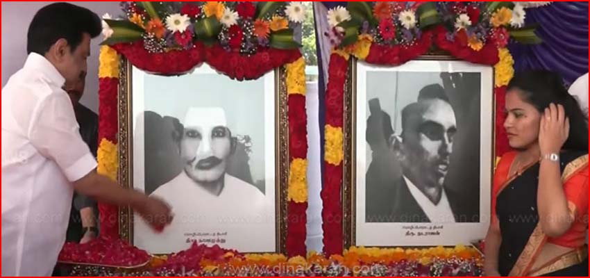 மூலக்கொத்தளத்தில் உள்ள மொழிப்போர் தியாகிகள் தாளமுத்து, நடராசன் நினைவிடங்கள் ரூ.34.30 லட்சம் செலவில் புதுப்பிக்கப்பட்ட நிலையில், அதை முதல்வர் மு.க ஸ்டாலின் திறந்து வைத்து, அங்கு வைக்கப்பட்டுள்ள உருவ படத்துக்கு மலர் தூவி மரியாதை செலுத்தினர். முதலமைச்சர் மு.க.ஸ்டாலின் உடன், துணை முதல்வர் உதயநிதி, அமைச்சர்கள், மேயர் உள்ளிட்டோர் மலர்தூவி மரியாதை செலுத்தினர்.