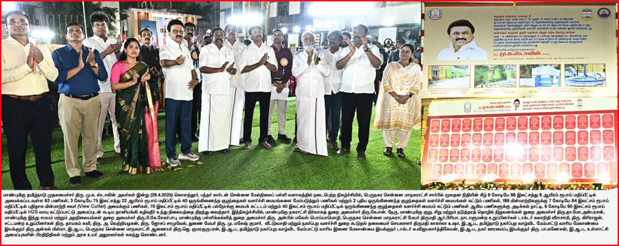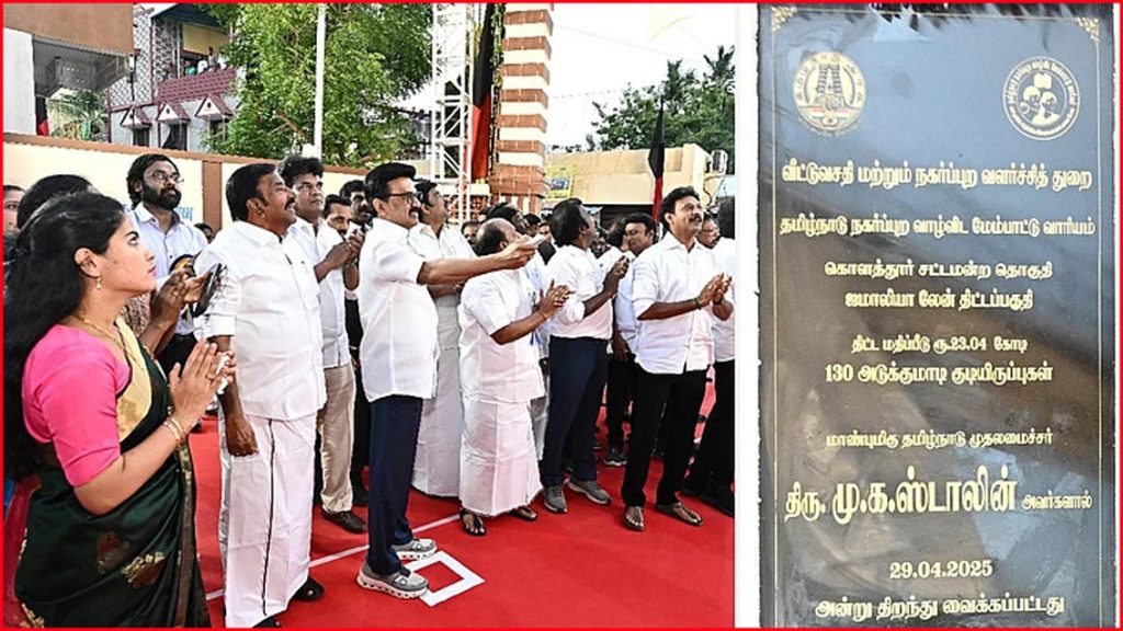 முதலமைச்சர் மு.க. ஸ்டாலின் நேற் று (29.4.2025) தமிழ்நாடு நகர்ப்புற வாழ்விட மேம்பாட்டு வாரியத்தின் சார்பில் கொளத்தூர், ஜமாலியா லேன் திட்டப்பகுதியில் 23 கோடியே 4 இலட்சம் ரூபாய் செலவில் கட்டப்பட்டுள்ள 130 அடுக்குமாடி குடியிருப்புகளை திறந்து வைத்து, பயனாளிகளுக்கு குடியிருப்புகளுக்கான ஒதுக்கீடு ஆணைகளை வழங்கினார். மேலும், கொளத்தூர் சட்டமன்றத் தொகுதிக்குட்பட்ட பகுதிகளில் 40 கோடியே 34 இலட்சத்து 28 ஆயிரம் ரூபாய் மதிப்பீட்டிலான புதிய திட்டப் பணிகளுக்கு அடிக்கல் நாட்டி, 6 கோடியே 90 இலட்சம் ரூபாய் செலவிலான முடிவுற்ற பணிகளை திறந்து வைத்து, பெரியார் அரசு மருத்துவமனையின் பயன்பாட்டிற்காக 40 இலட்சத்து 74 ஆயிரம் ரூபாய் மதிப்பிலான மூன்று வாகனங்களை கொடியசைத்து தொடங்கி வைத்தார்.