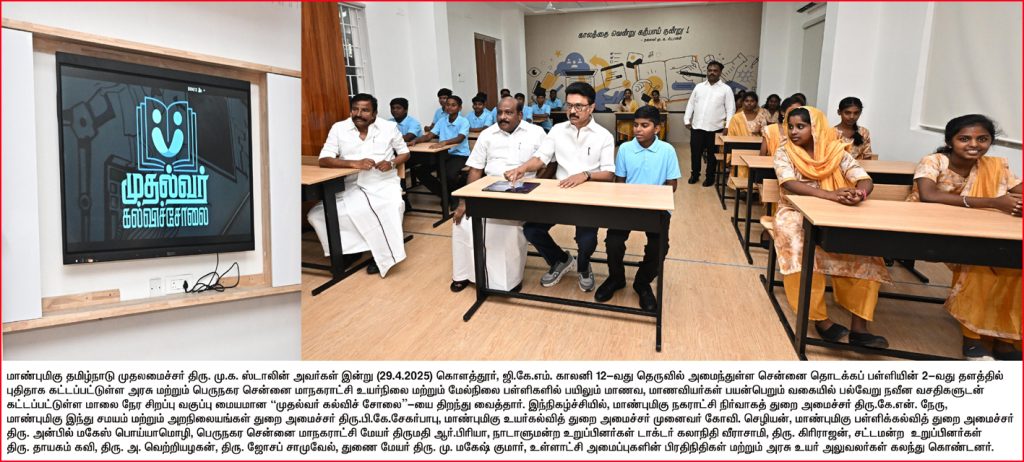கொளத்தூர், ஜி.கே.எம். காலனி 12-வது தெருவில் அமைந்துள்ள சென்னை தொடக்கப் பள்ளியின் 2-வது தளத்தில் புதிதாக கட்டப்பட்டுள்ள அரசு மற்றும் பெருநகர சென்னை மாநகராட்சி உயர்நிலை மற்றும் மேல்நிலை பள்ளிகளில் பயிலும் மாணவ, மாணவியர்கள் பயன்பெறும் வகையில் டிஜிட்டல் பலகை, மேஜைகள், நாற்காலிகள், குளிர்சாதன வசதியுடன் கூடிய ஒரு வகுப்பறை, மூன்று வகுப்பறைகள் உள்ளிட்ட பல்வேறு நவீன வசதிகளுடன் கட்டப்பட்டுள்ள மாலை நேர சிறப்பு வகுப்பு மையமான “முதல்வர் கல்விச் சோலை”-யை மாண்புமிகு தமிழ்நாடு முதலமைச்சர் அவர்கள் திறந்து வைத்து, பார்வையிட்டார். மேலும், முதல்வர் கல்விச் சோலை மையத்தில் பயிலும் மாணவ, மாணவியர்களுடன் கலந்துரையாடினார்.