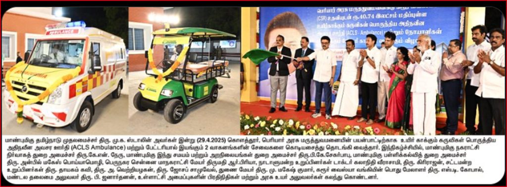 கொளத்தூர், பெரியார் அரசு மருத்துவமனையின் பயன்பாட்டிற்காக கரூர் வைஸ்யா வங்கியின் பெருநிறுவன சமூகப் பொறுப்பு நிதியிலிருந்து 40 இலட்சத்து 74 ஆயிரம் ரூபாய் மதிப்பிலான உயிர் காக்கும் கருவிகள் பொருத்திய அதிநவீன அவசர ஊர்தி (ACLS Ambulance) மற்றும் பேட்டரியால் இயங்கும் 2 வாகனங்களின் சேவைகளை தமிழ்நாடு முதலமைச்சர் அவர்கள் கொடியசைத்து தொடங்கி வைத்தார்.