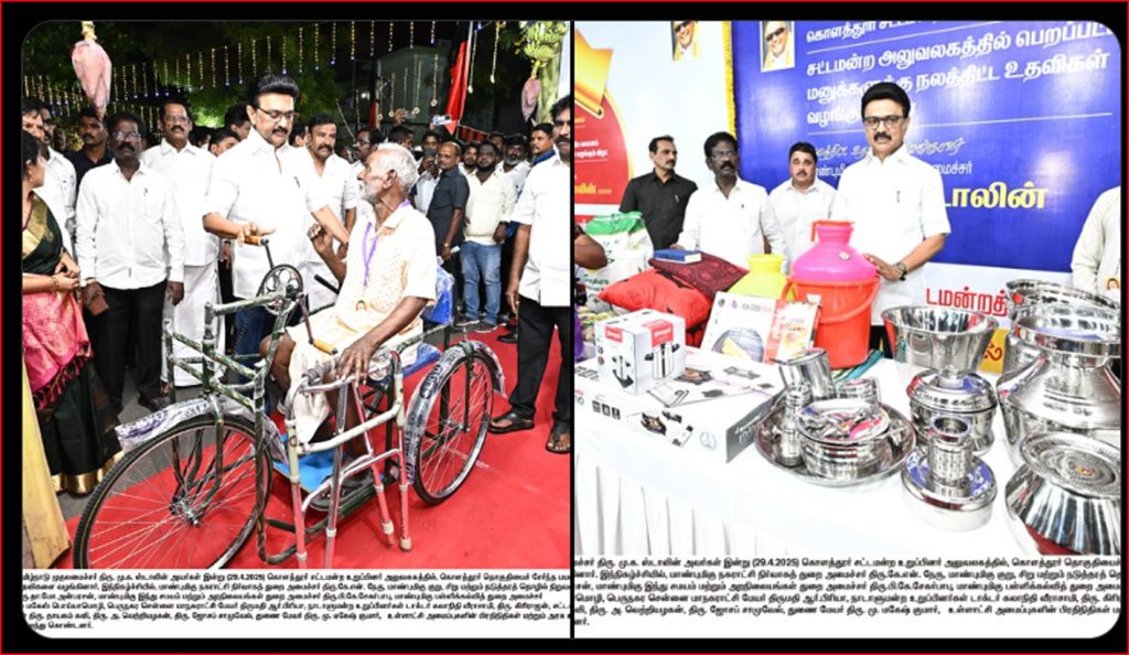 முன்னதாக, கொளத்தூர் சட்டமன்ற உறுப்பினர் அலுவலகத்தில், கொளத்தூர் தொகுதியைச் சேர்ந்த 189 பயனாளிகளுக்கு மருத்துவ உதவித்தொகை, திருமண உதவித்தொகை, பள்ளி மற்றும் கல்லூரி மாணவ, மாணவியர்களுக்கு கல்வி உதவித்தொகை, மாவு அரவை இயந்திரங்கள், சலவைப் பெட்டிகள், மாற்றுத்திறனாளிகளுக்கு மூன்று சக்கர மோட்டார் வாகனங்கள், மூன்று சக்கர சைக்கிள் உள்ளிட்ட பல்வேறு நலத்திட்ட உதவிகளை தமிழ்நாடு முதலமைச்சர் அவர்கள் வழங்கினார்.