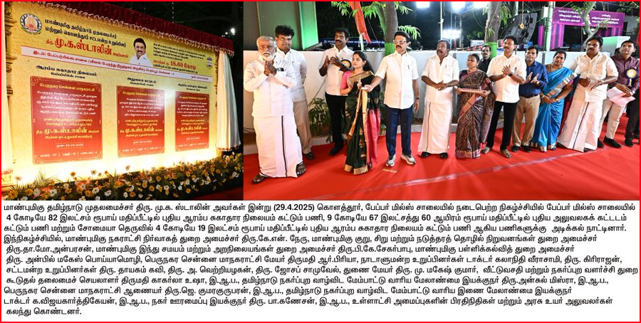 பெருநகர சென்னை மாநகராட்சியின் மூலதன நிதியின் கீழ், திரு.வி.க. மண்டலம், பேப்பர் மில்ஸ் சாலையில் 4 கோடியே 82 இலட்சம் ரூபாய் மதிப்பீட்டில் புதிய ஆரம்ப சுகாதார நிலையம் கட்டும் பணி, 9 கோடியே 67 இலட்சத்து 60 ஆயிரம் ரூபாய் மதிப்பீட்டில் புதிய அலுவலகக் கட்டடம் கட்டும் பணி மற்றும் சோமையா தெருவில் 4 கோடியே 19 இலட்சம் ரூபாய் மதிப்பீட்டில் புதிய ஆரம்ப சுகாதார நிலையம் கட்டும் பணி, என மொத்தம் 18 கோடியே 69 இலட்சம் ரூபாய் மதிப்பீட்டிலான புதிய திட்டப் பணிகளுக்கு தமிழ்நாடு முதலமைச்சர் அவர்கள் அடிக்கல் நாட்டினார்.