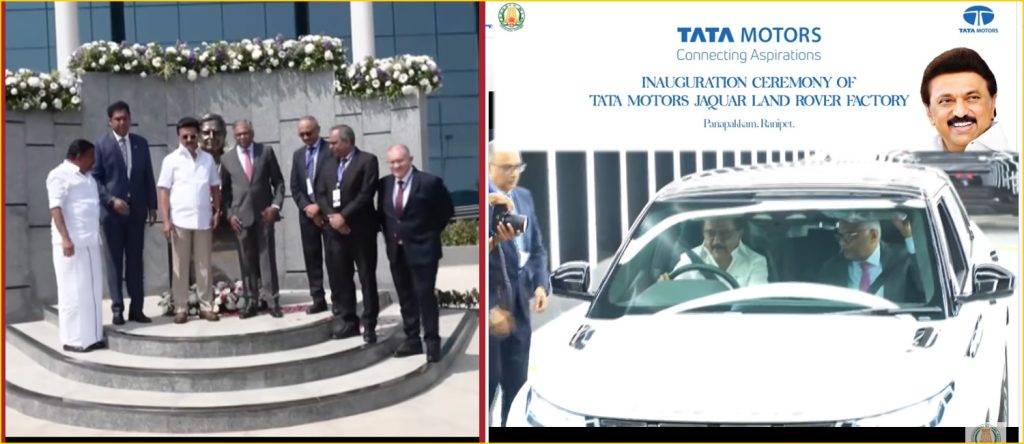 ராணிப்பேட்டையில் அமைக்கப்பட்டுள்ள டாடா நிறுவனத்தின் ஜாகுவார் லேண்ட் ரோவர் கார் உற்பத்தி ஆலையை முதலமைச்சர் மு.க.ஸ்டாலின் இன்று திறந்து வைத்தார். இந்த ஆலைக்கு கடந்த 2024ம் ஆண்டு செப்டம்பரில் அடிக்கல் நாட்டப்பட்ட நிலையில், ஆலையை இன்று உற்பத்திக்காக திறந்து வைக்கப்பட்டு உள்ளது.