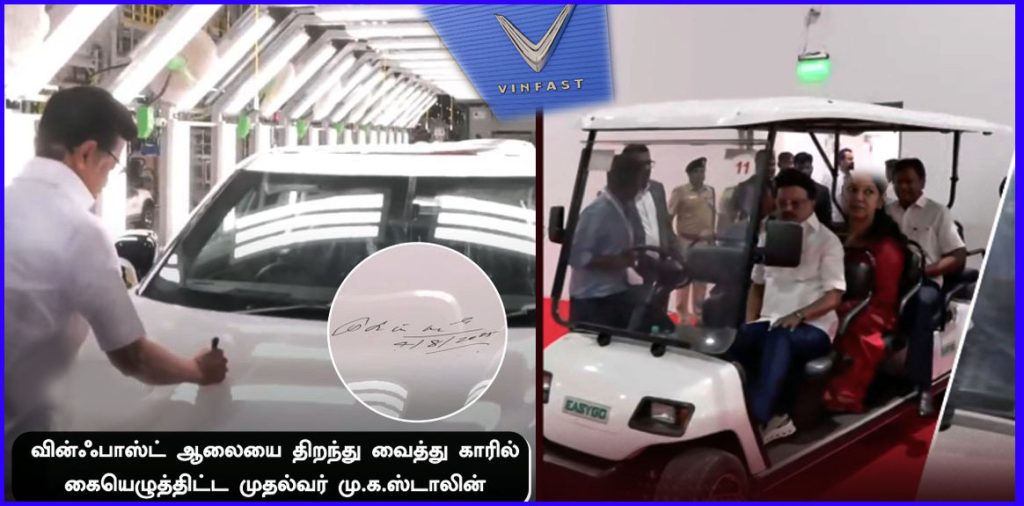 தூத்துக்குடி: தூத்துக்குடி சிப்காட்டில் அமைந்துள்ள வியட்நாமைச் சேர்ந்த  வின்ஃபாஸ்ட் மின்சார கார் தயாரிப்பு  ஆலையை இன்று  திறந்து வைத்த முதல்வர் ஸ்டாலின் , அங்கு நடைபெற்ற நிகழ்ச்சியில், தூத்துக்குடியில் தயாரிக்கப்பட்ட முதல் காரில் கையெழுத்திட்டு விற்பனையையும்  தொடங்கி வைத்தார்.