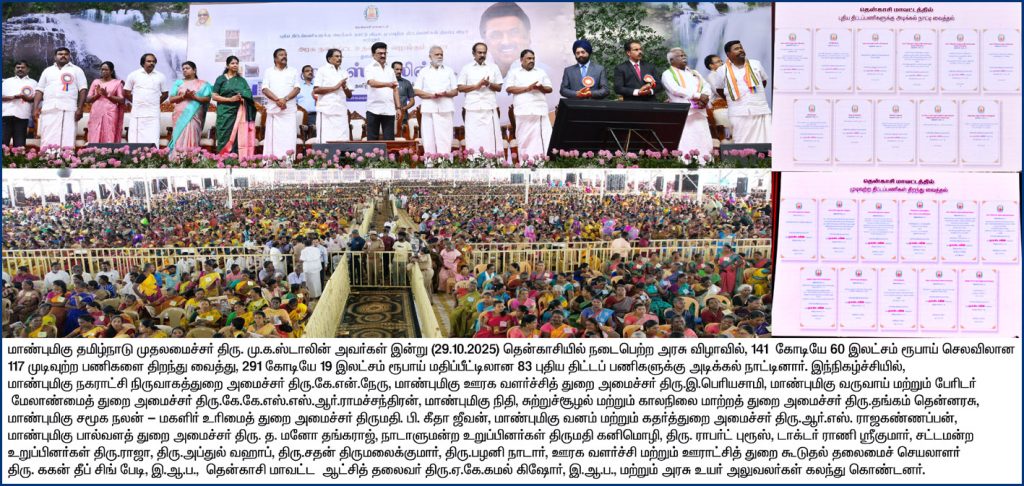 தென்காசி மாவட்டம் மைய நூலகம், தென்காசி மகப்பேறு மையம் மற்றும் குழந்தைகள் நல கட்டிடம், மாறாந்தையில் அரசு மேல்நிலைப்பள்ளி வகுப்பறைகள், புளியங்குடி சார்பதிவாளர் அலுவலகம் உள்ளிட்ட ரூ.141 கோடியே 60 லட்சம் செலவிலான 117 முடிவுற்ற திட்டப்பணிகளை திறந்து வைத்தார். தொடர்ந்து 2 லட்சத்து 44 ஆயிரத்து 469 பயனாளிகளுக்கு ரூ.587 கோடியே 39 லட்சம் மதிப்பிலான அரசு நலத்திட்ட உதவிகளை முதலமைச்சர் மு.க.ஸ்டாலின் வழங்கினார். மேலும் ரூ.291 கோடியே 19 லட்சம் மதிப்பிலான 83 புதிய திட்டப்பணிகளுக்கு முதலமைச்சர் மு.க.ஸ்டாலின் அடிக்கல் நாட்டினார். மொத்தம் 1020 கோடி மதிப்பிலான பணிகளை தொடங்கி வைத்தார்.