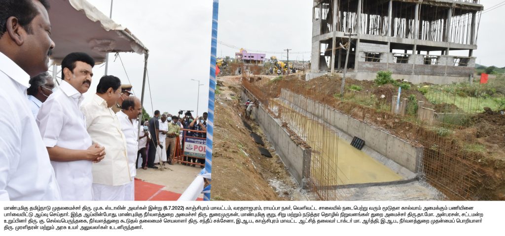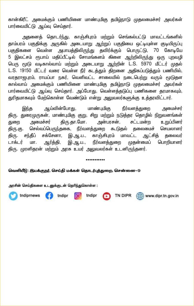 சென்னை: காஞ்சிபுரம் மாவட்டத்தில் 120 கோடியே 75 இலட்சம் ரூபாய் மதிப்பீட்டில் மேற்கொள்ளப்பட்டு வரும் வெள்ளத் தடுப்புப் பணிகளை தமிழ்நாடு முதலமைச்சர் .மு.க.ஸ்டாலின் அவர்கள் பார்வையிட்டு ஆய்வு செய்தார்.