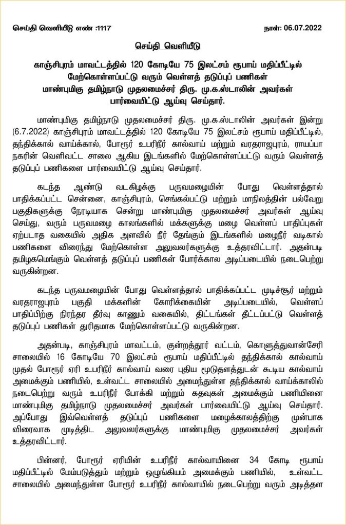 சென்னை: காஞ்சிபுரம் மாவட்டத்தில் 120 கோடியே 75 இலட்சம் ரூபாய் மதிப்பீட்டில் மேற்கொள்ளப்பட்டு வரும் வெள்ளத் தடுப்புப் பணிகளை தமிழ்நாடு முதலமைச்சர் .மு.க.ஸ்டாலின் அவர்கள் பார்வையிட்டு ஆய்வு செய்தார்.