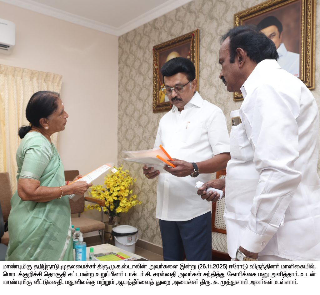 ஈரோடு: தமிழ்நாடு முதலமைச்சர் மு.க.ஸ்டாலின் நேற்று (26.11.2025) ஈரோடு மாவட்டத்தில் நடைபெற்ற அரசு விழாவில், முடிவுற்ற பணிகளை திறந்து வைத்து, புதிய திட்டப் பணிகளுக்கு அடிக்கல் நாட்டி, பயனாளிகளுக்கு அரசு நலத்திட்ட உதவிகளை வழங்கினார்.