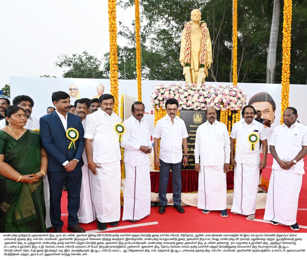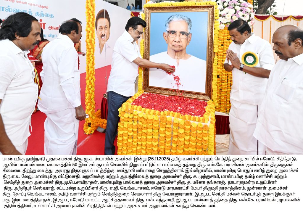 ஈரோடு, சித்தோடு, ஆவின் பால்பண்ணை வளாகத்தில் 50 இலட்சம் ரூபாய் செலவில் நிறுவப்பட்டுள்ள பால்வளத் தந்தை எஸ்.கே.பரமசிவன் திருவுருவச் சிலையை திறந்து வைத்தார்