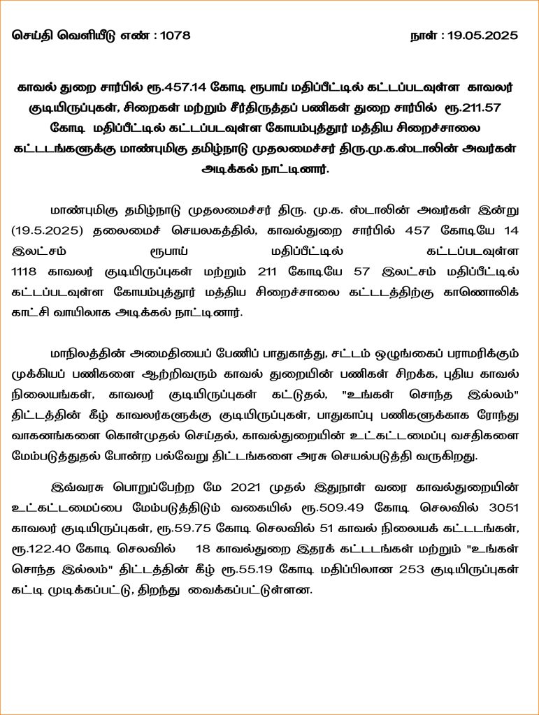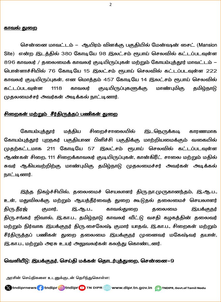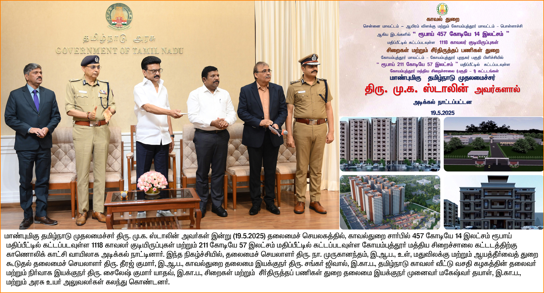 சென்னை: தமிழ்நாடு முதலமைச்சர் மு.க.ஸ்டாலின், இன்று ரூ. 457 கோடி மதிப்பீட்டில் காவலர் குடியிருப்புகள் மற்றும் சிறைச்சாலை கட்டிடங்களுக்கு அடிக்கல் நாட்டினார்.
