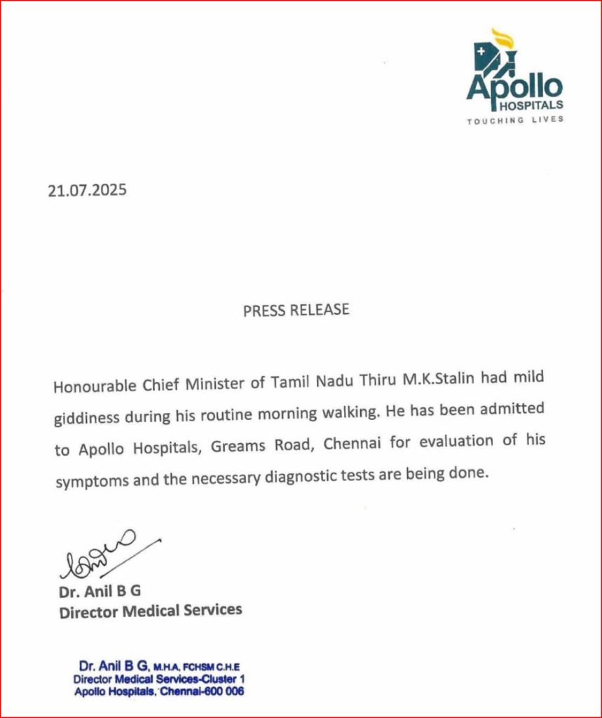 காலை நடைபயிற்சியின்போது முதலமைச்சர் மு.க.ஸ்டாலினுக்கு லேசான தலைச்சுற்றல் ஏற்பட்டது. முதலமைச்சருக்கு தேவையான அனைத்து மருத்துவ பரிசோதனைகளும் மேற்கொள்ளப்படுகிறது என்று அப்பல்லோ மருத்துவமனை தெரிவித்துள்ளது.