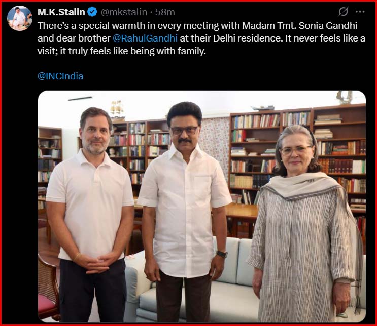 டெல்லி: இன்று நடைபெற உள்ள நிதிஆயோக் கூட்டத்தில் கலந்துகொள்ள டெல்லி சென்றுள்ள முதலமைச்சர் ஸ்டாலின், டெல்லியில் சோனியா காந்தி, ராகுல் காந்தியை சந்தித்து பேசினார். இந் சந்திப்பானது குடும்பத்தினரை சந்தித்தது போல இருந்தது முதலமைச்சர் பதிவிட்டு உள்ளார்.